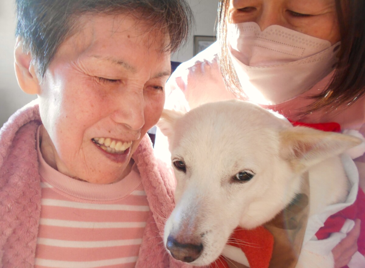 朝の癒しタイム。エルとご利用者の朝のご挨拶です。